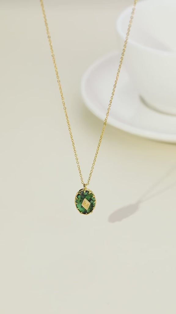 Um colar de estética sofisticada e contemporânea, com pingente oval em turquesa africana que traz profundidade de cor e um detalhe central marcante. A corrente de elos em banho de ouro 18K PVD completa o visual com presença na medida certa.